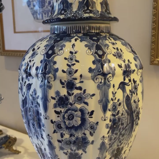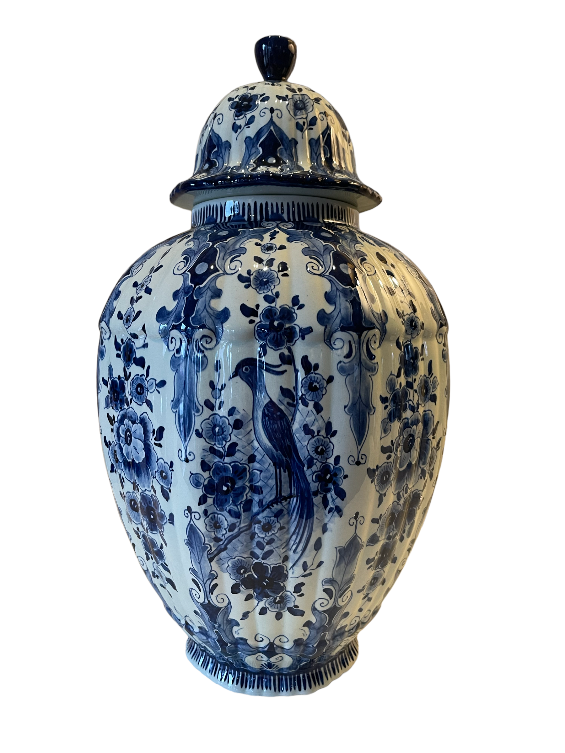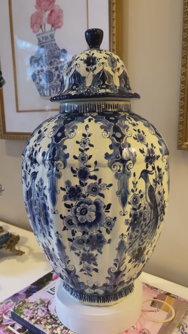 Royal Delft Hand-Painted Blue and White Ginger Jar with bird patterns.
